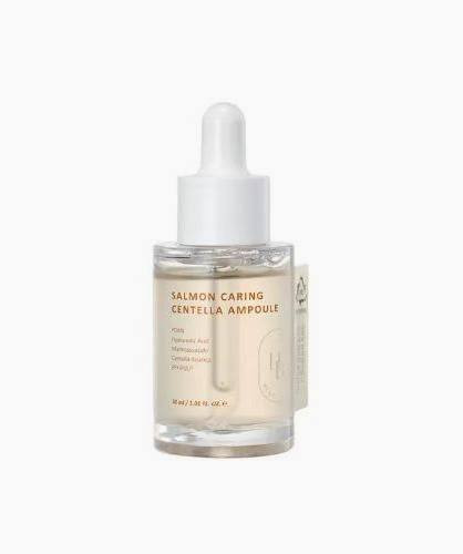 A HEVEBLUE Salmon Caring Centella Ampoule egy ultra-koncentrált, mégis frissítő textúrájú szérum, amely a bőr azonnali megnyugtatására és regenerálására született. A formula különlegessége, hogy desztillált víz helyett 85% Centella Asiatica (ázsiai gázló) levélvizet tartalmaz, ami azonnal csillapítja a gyulladásokat.